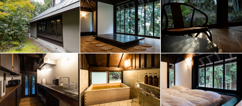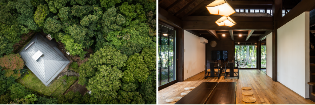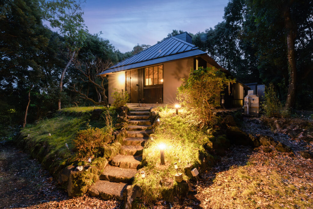 アプローチを抜けると、豊かな森に囲まれた静かな山あいに佇む古民家風ヴィラが現れます。