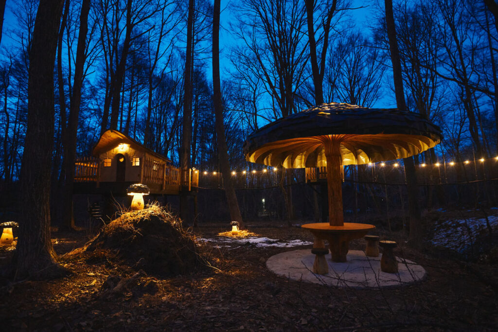 夜になると、吊橋や庭の灯りがやわらかく灯り、きのこ型のテーブルや焚き火の炎とともに、まるで絵本の中のような幻想的な雰囲気に。
