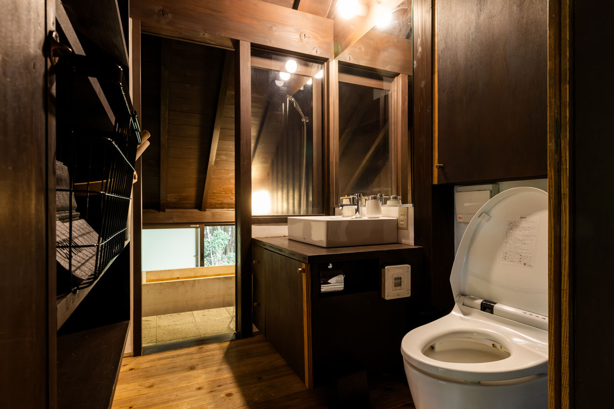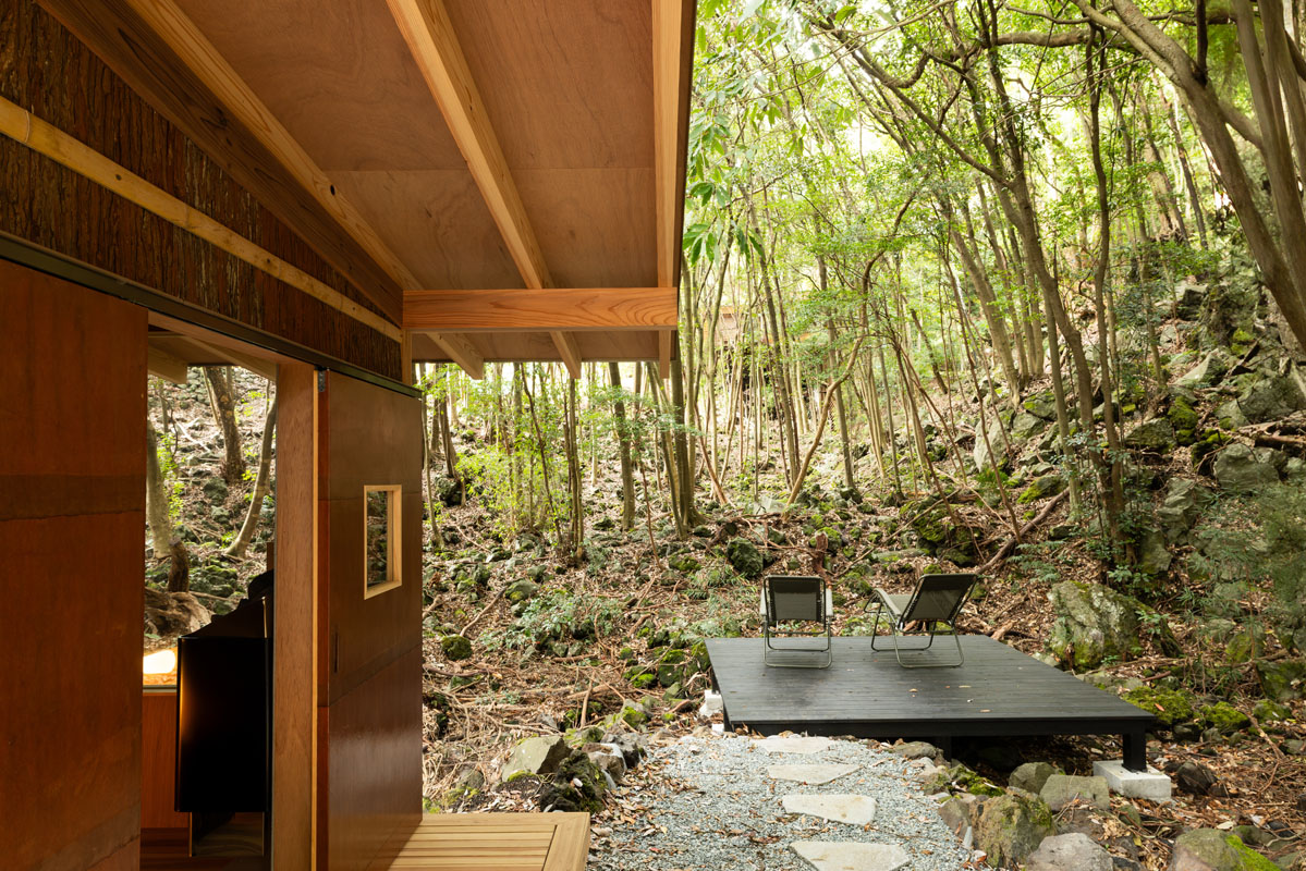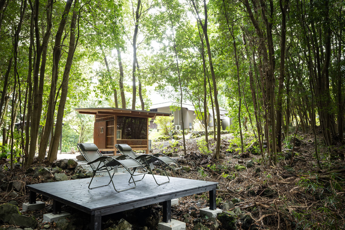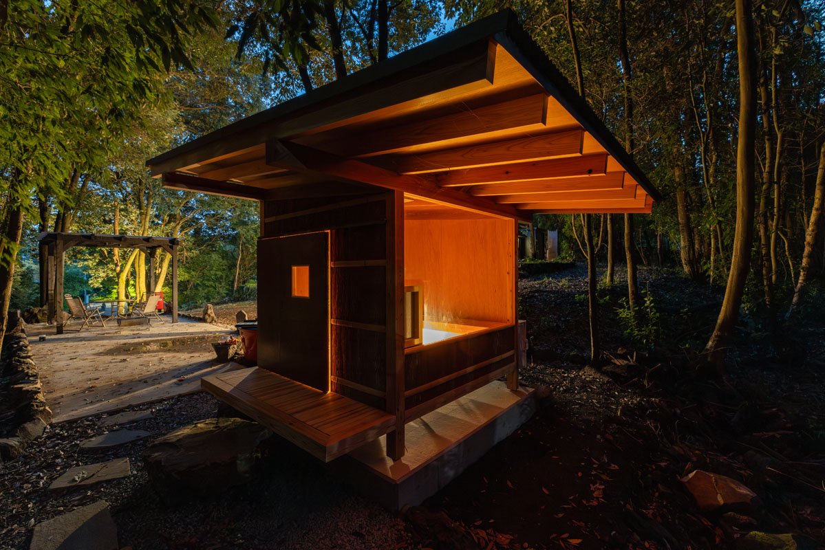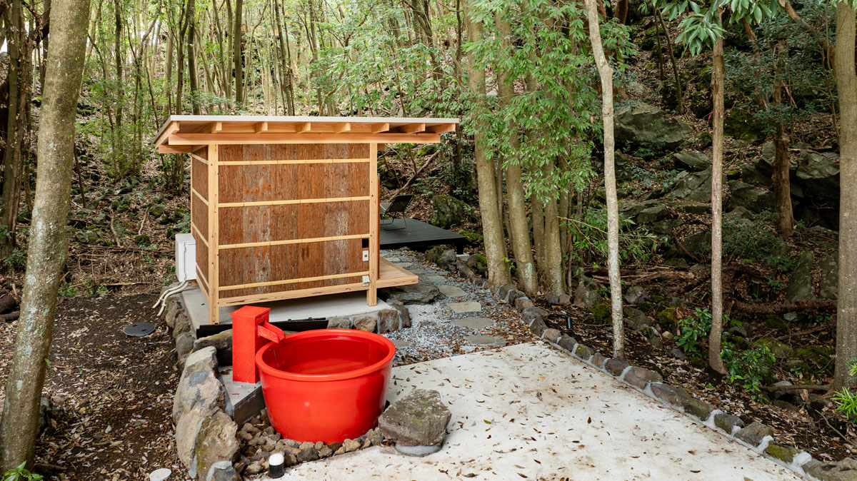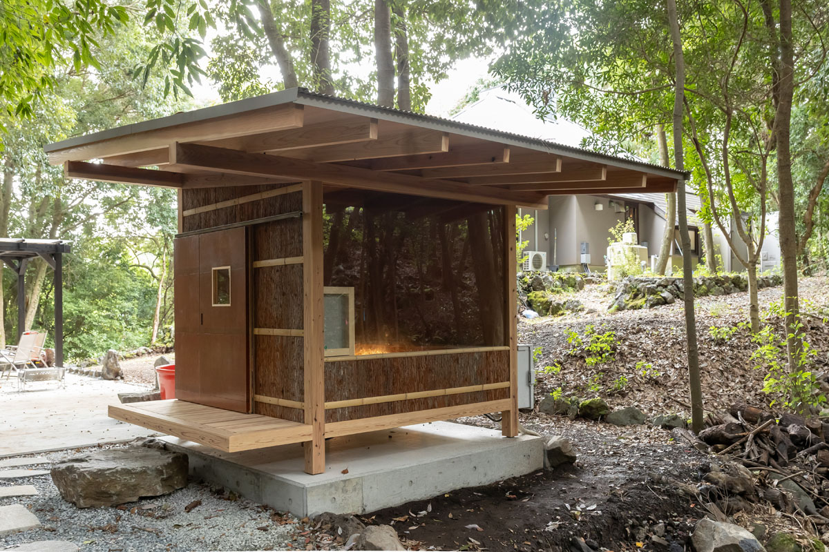 離れには、赤沢の森に溶け込むように佇むDAICHI監修の電気サウナ。