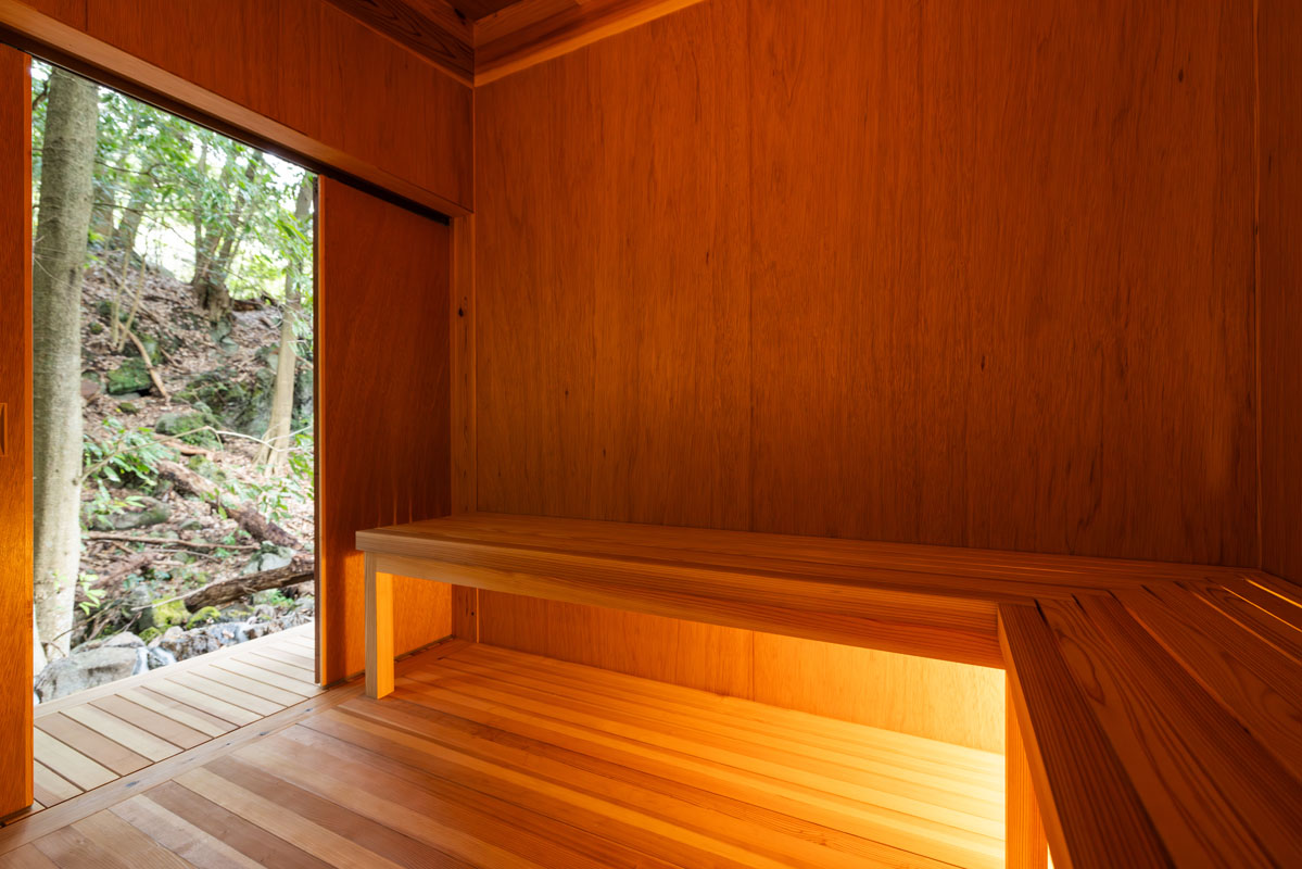 正面は大きなガラス張りになっており、サ室にいながら森の緑が静かに視界へ広がります。