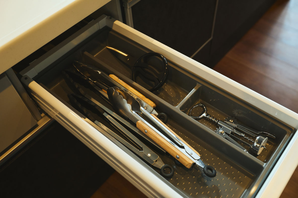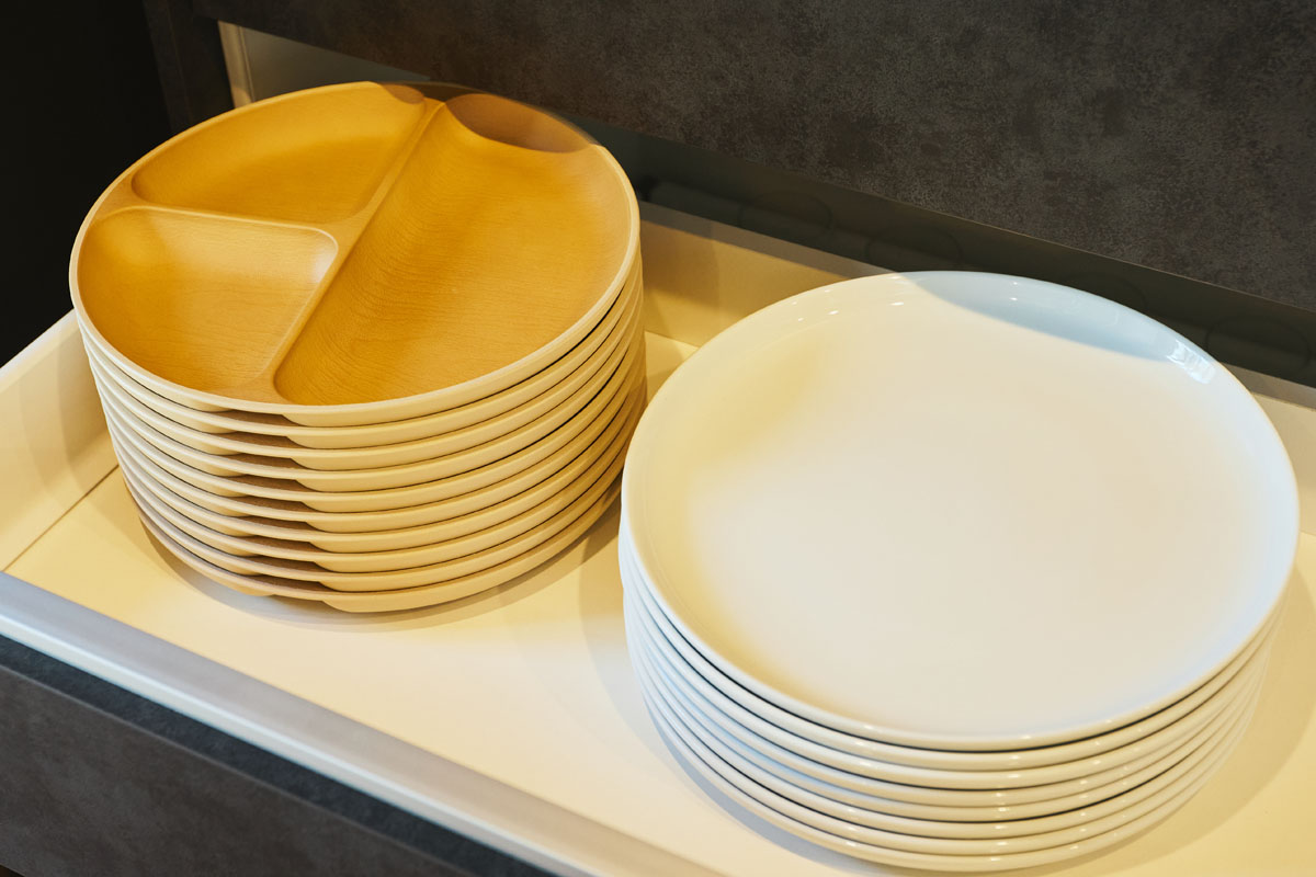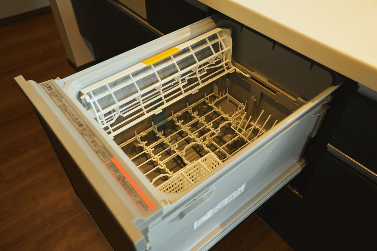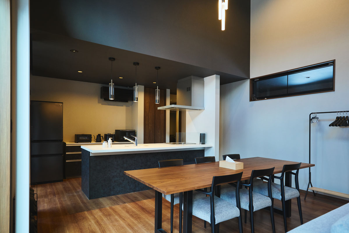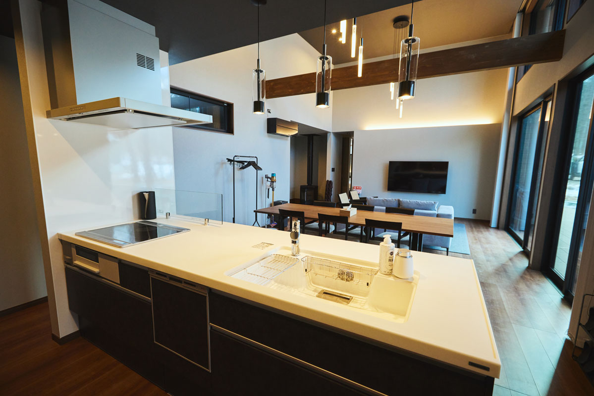高天井のリビングダイニングとモダンなキッチンが、みんなで囲む時間を心地よく支えます。