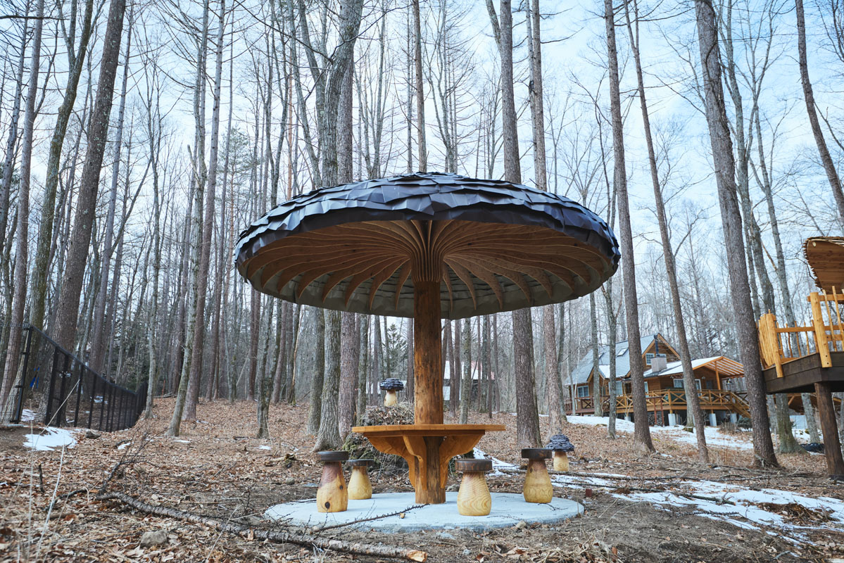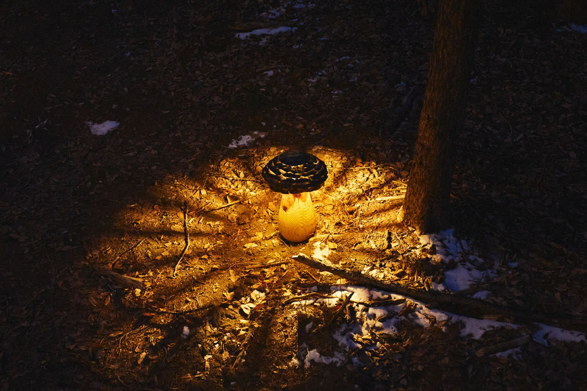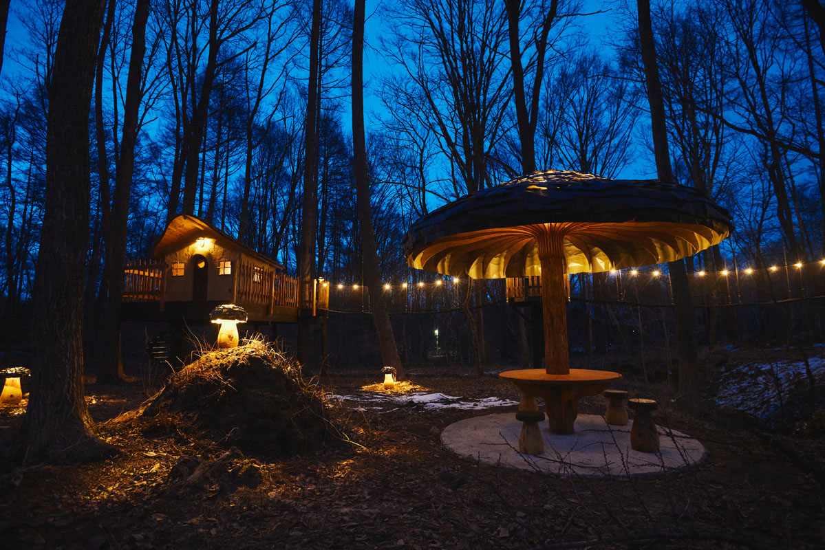 夜は焚き火を囲み、きのこ型の灯りが森をやさしく照らす。