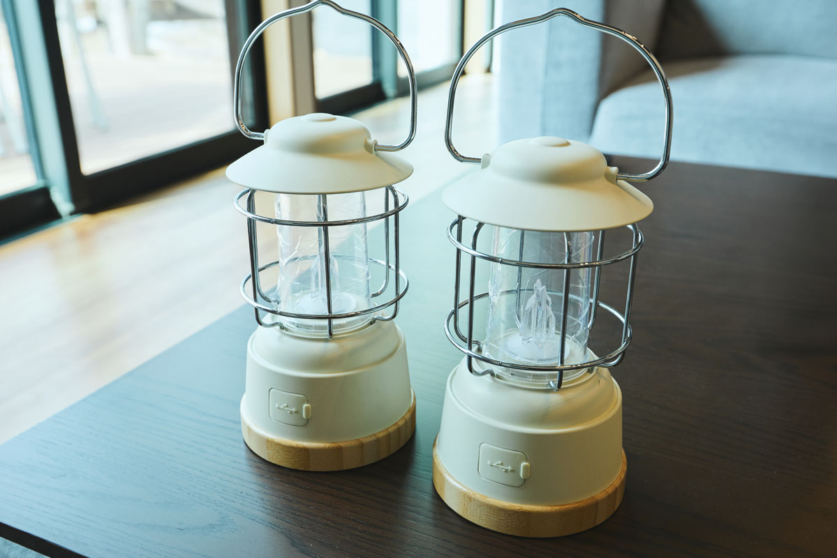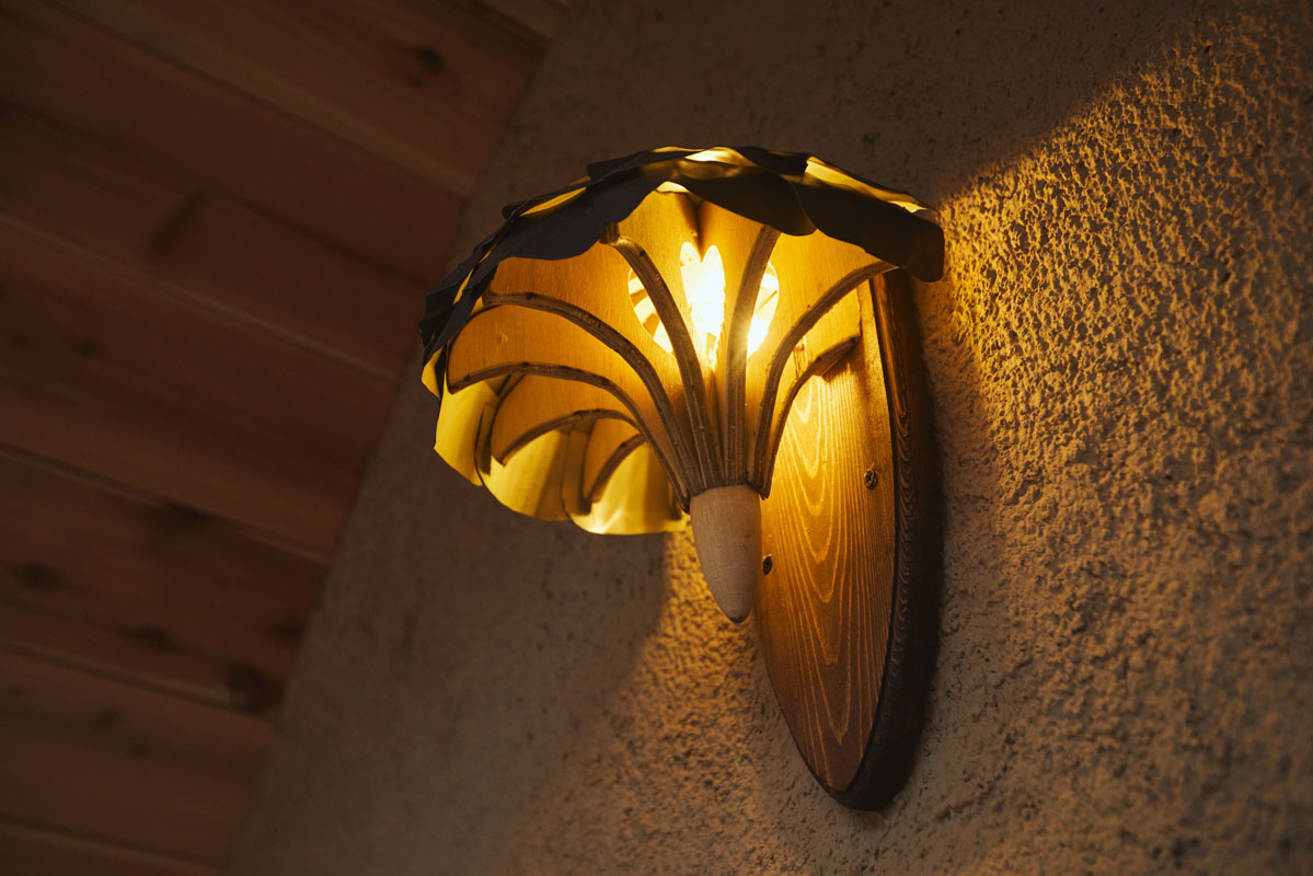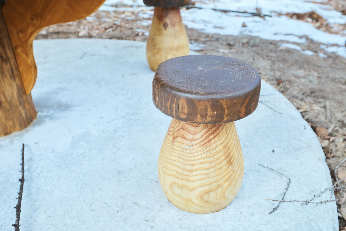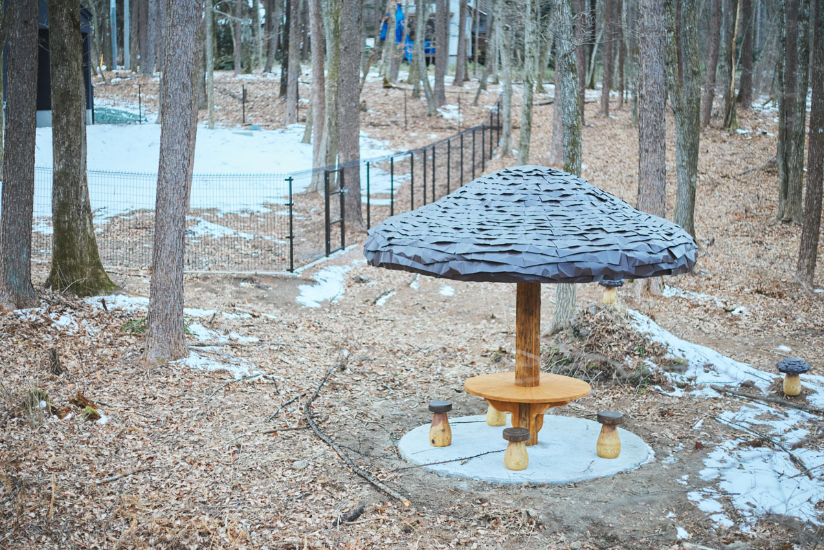 夜は焚き火を囲み、きのこ型の灯りが森をやさしく照らす。