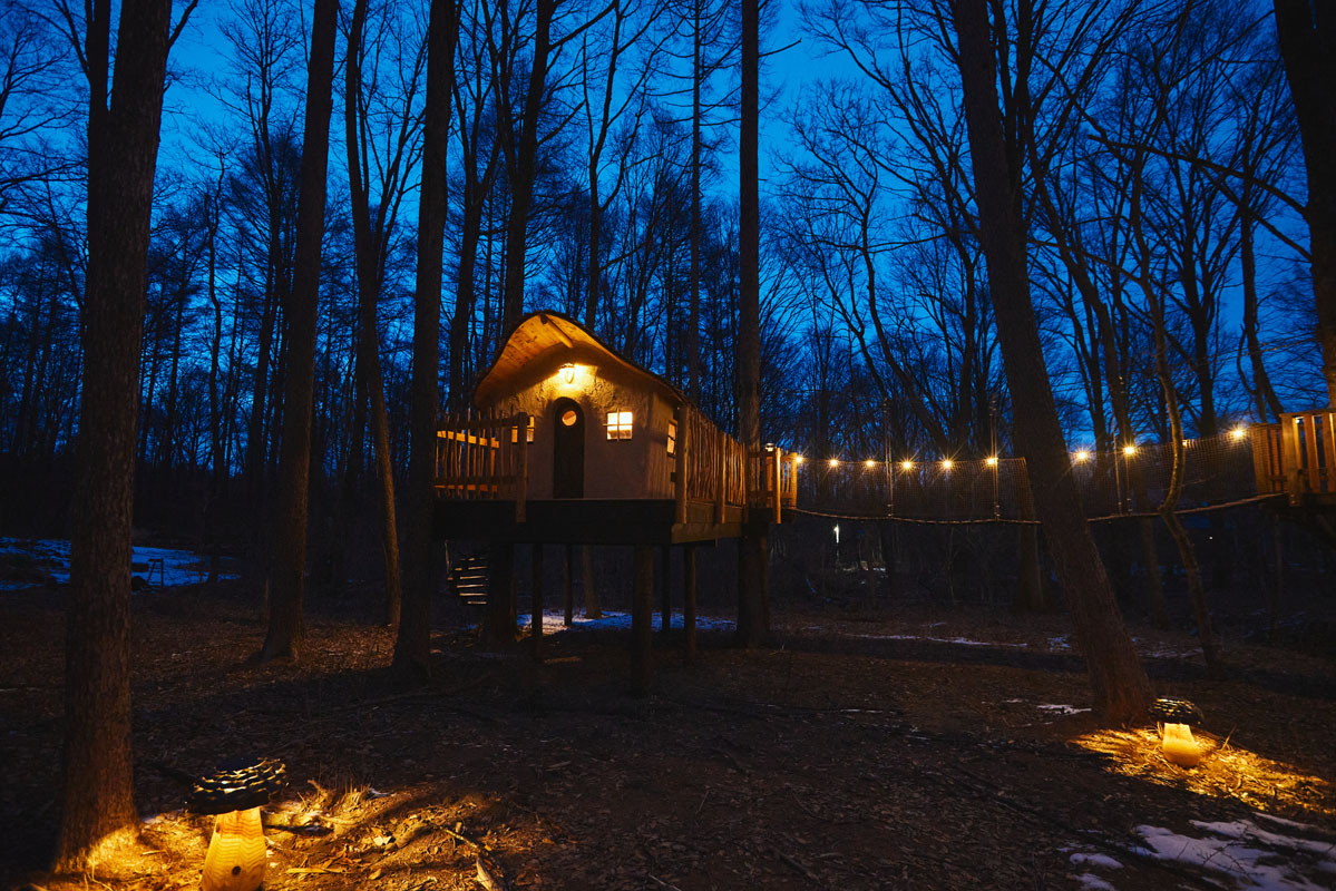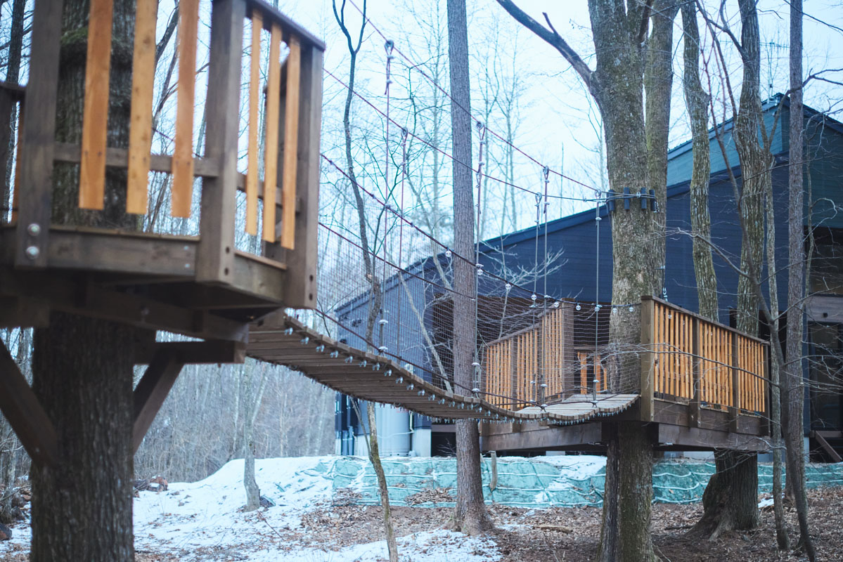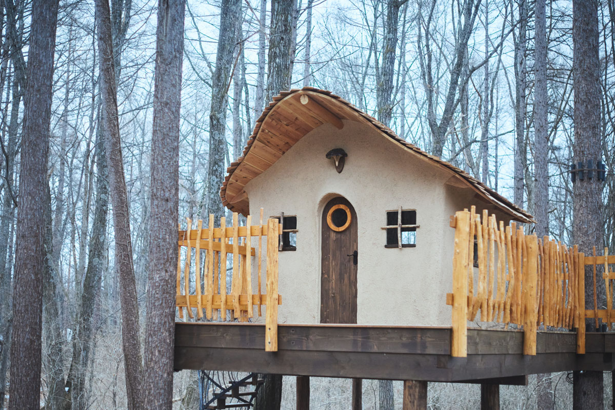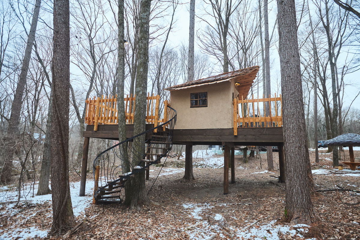 木々のあいだに浮かぶツリーハウスは、子どもにとっては秘密基地のように、