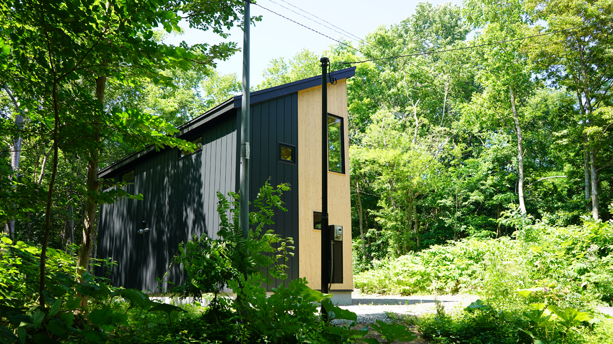 建物の外に増築された、黒くシックな佇まいのサウナ室。