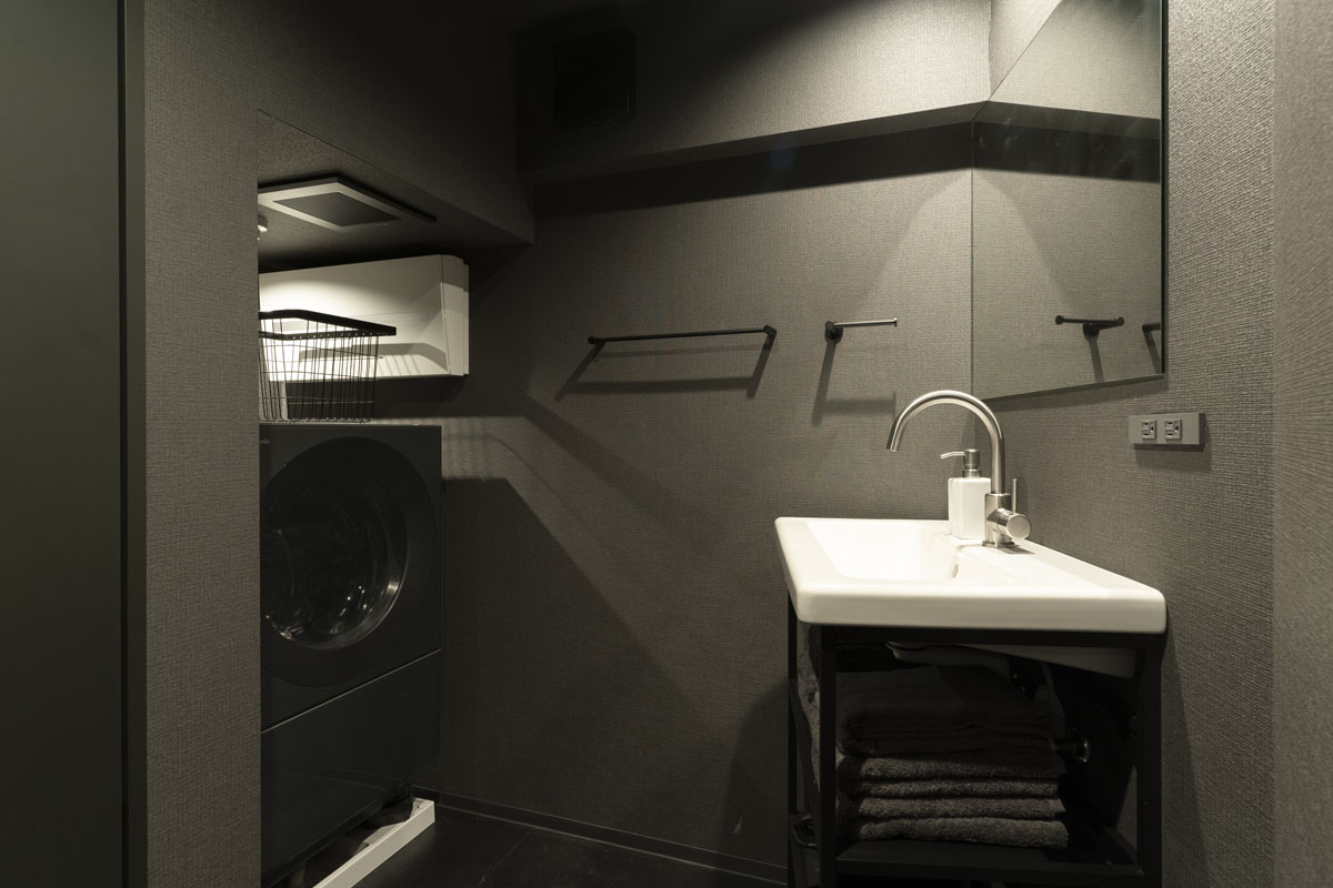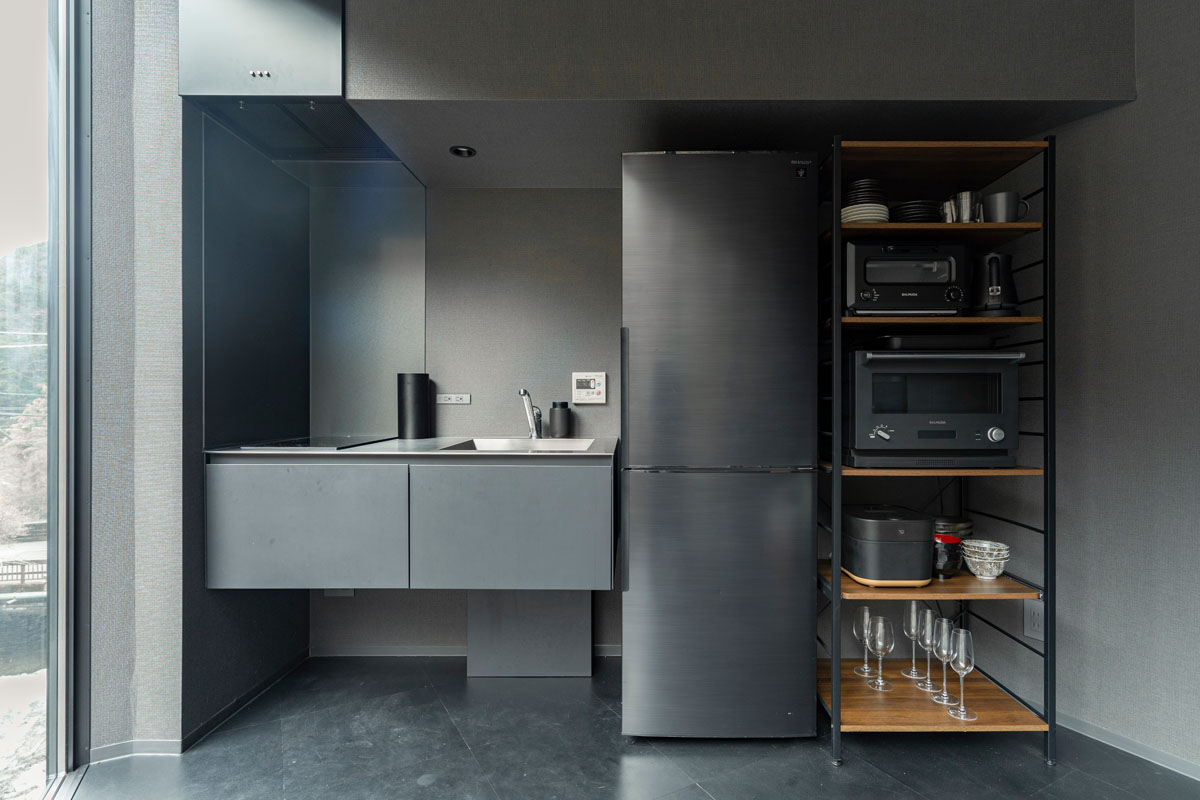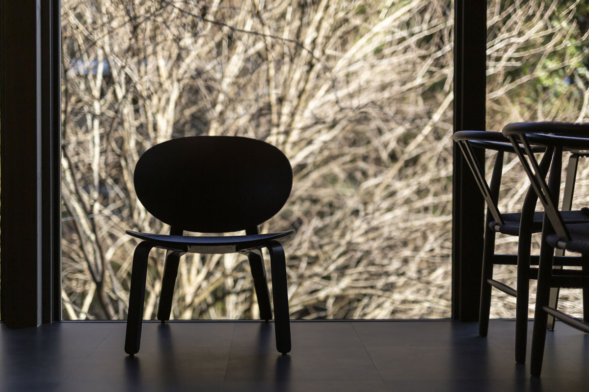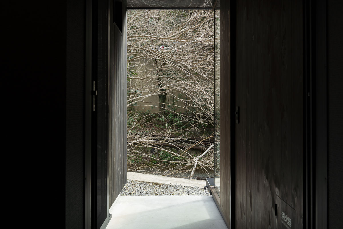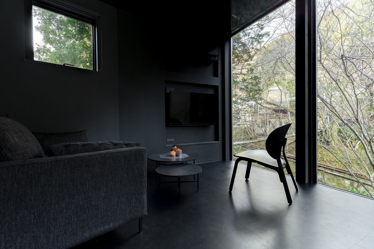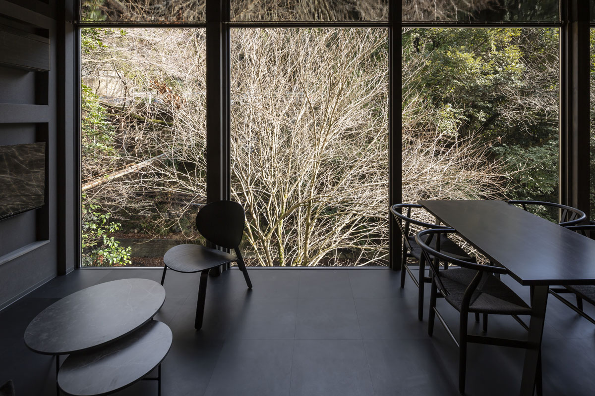 室内は黒を基調とし、視覚的な要素を抑えることで、川の風景だけが際立つ空間に仕上げました。